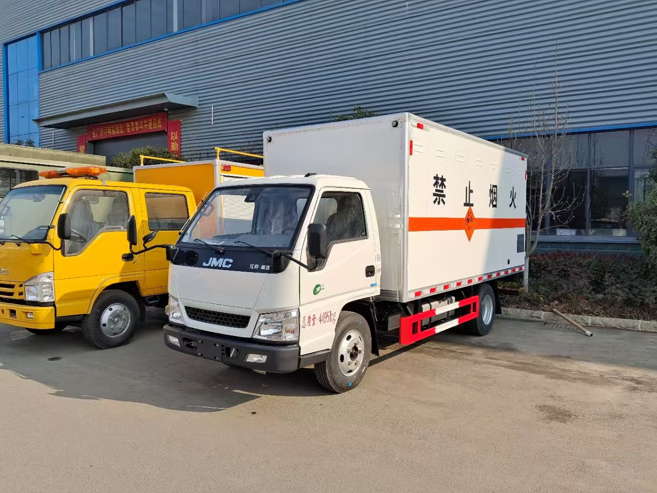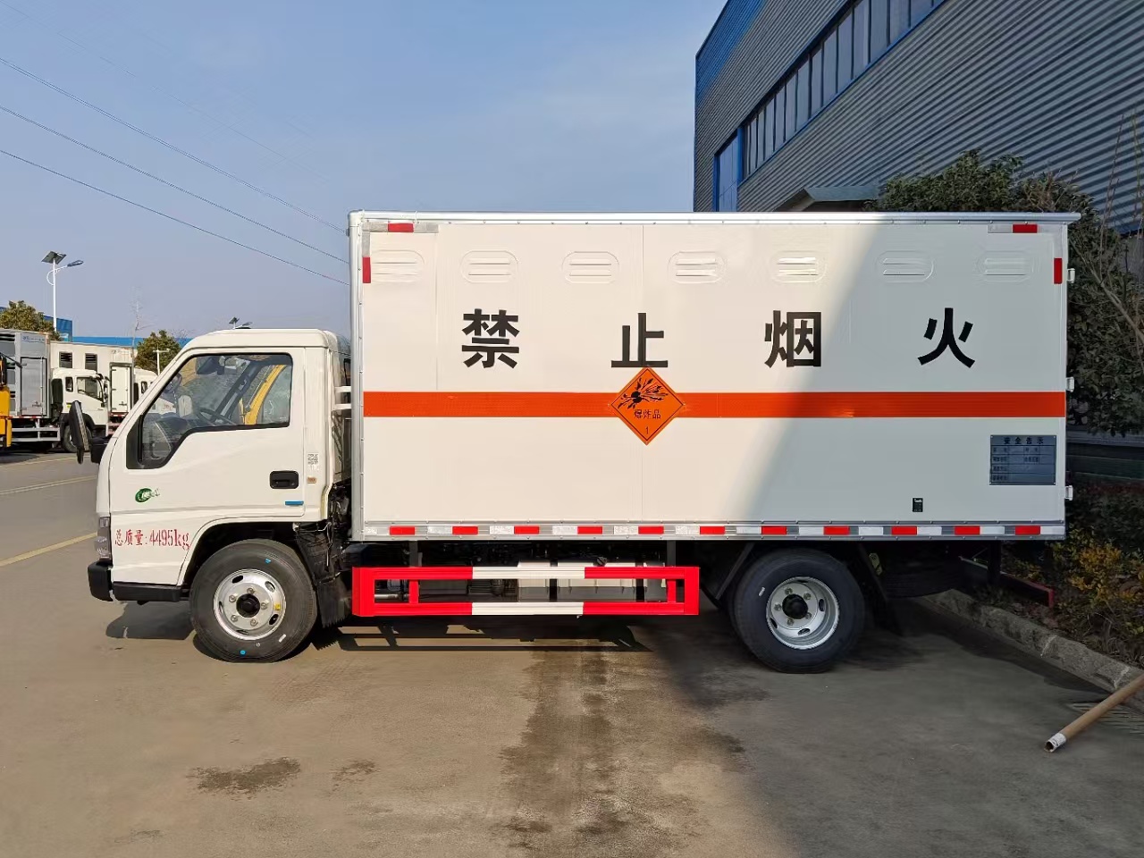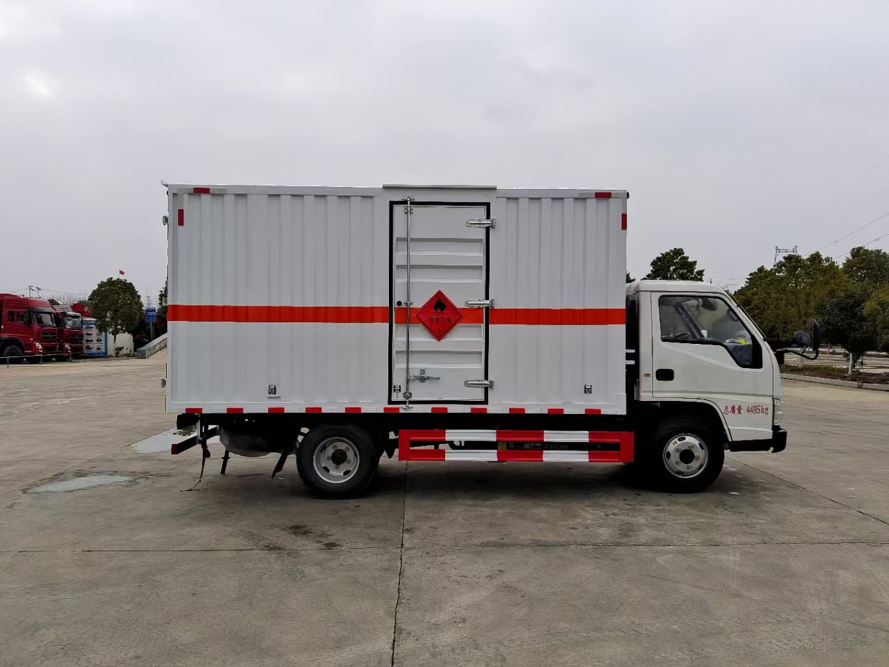 | 貨箱配置 | 廂體為雙層金屬骨架結(jié)構(gòu),外板采用冷軋鋼板,中間填充阻燃泡沫,內(nèi)飾為鋁板。底板為平板上鋪防靜電膠皮。廂內(nèi)兩側(cè)加裝固定貨物臥環(huán),門(mén)框帶防盜報(bào)警器,頂部帶煙霧報(bào)警器,廂體右側(cè)選裝側(cè)門(mén),隨車(chē)配2個(gè)滅火器,危險(xiǎn)標(biāo)志牌,防火帽,危險(xiǎn)品三角頂燈。 | ||